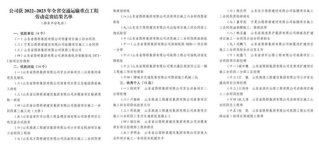 近日,山东省交通运输厅、山东省总工会联合公布了2022-2023年全省交通运输重点工程劳动竞赛结果,公司在竞赛中荣获4个优胜单位、14个优胜班组和15名优秀个人。